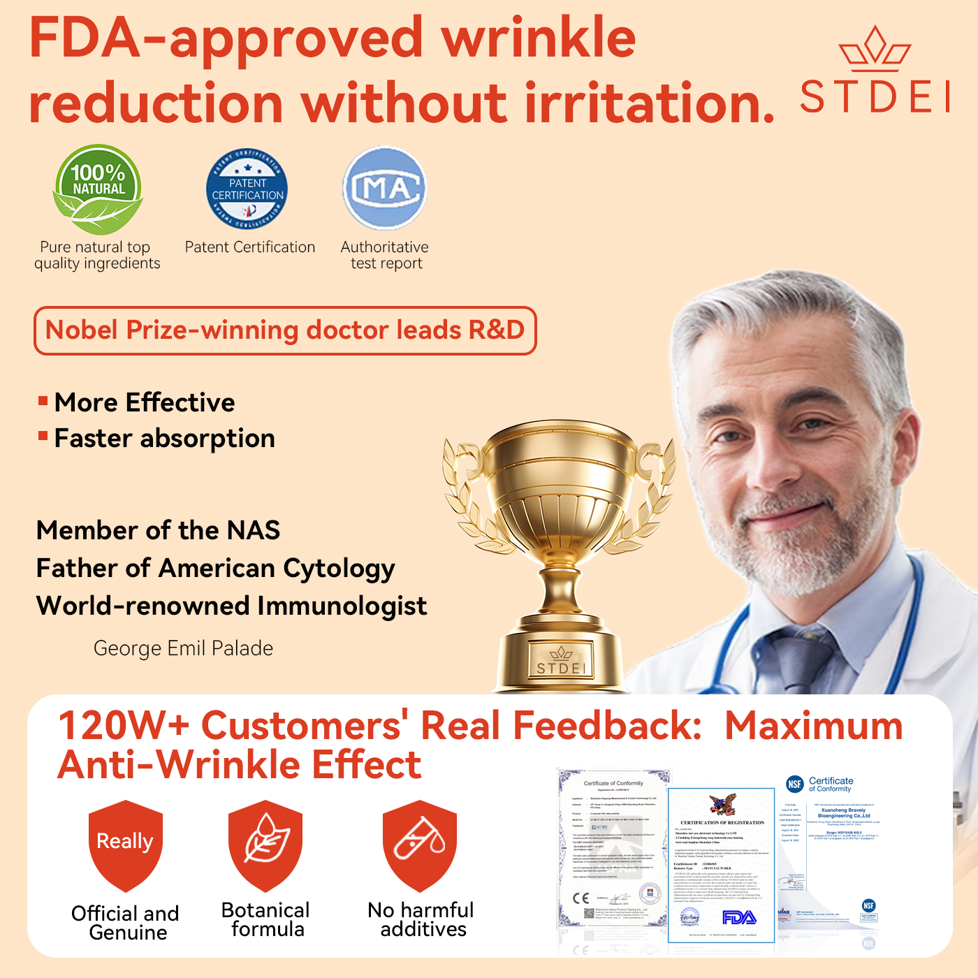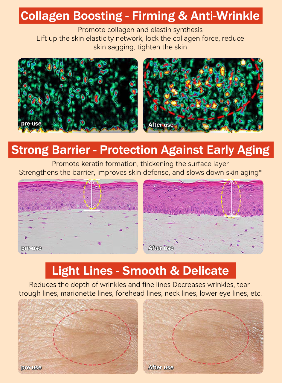 - Κλινικά αποδεδειγμένα αποτελέσματα: Μειώνει τις λεπτές γραμμές και τις ρυτίδες, συσφίγγει το δέρμα με αισθητές βελτιώσεις.